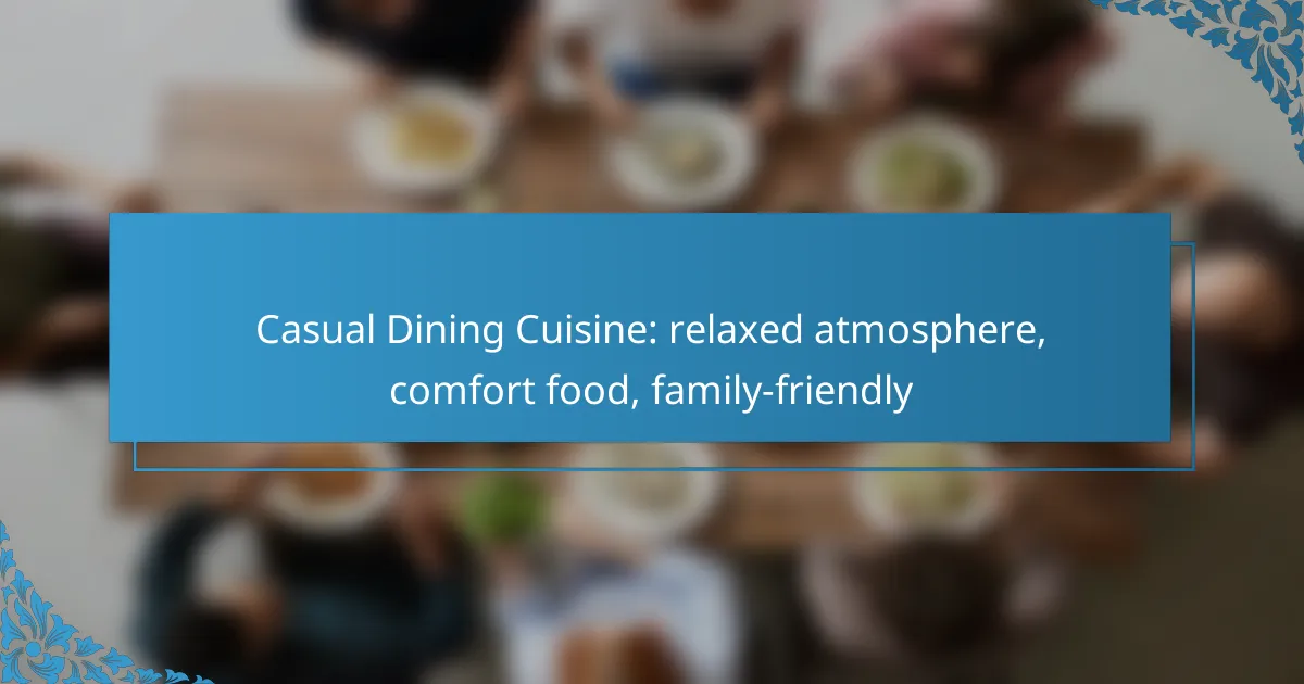 A relaxed atmosphere in casual dining is characterized by comfort and accessibility, making it ideal for families and friends to enjoy meals together. Key features include comfortable seating, soft lighting, and casual decor that collectively create an inviting environment.